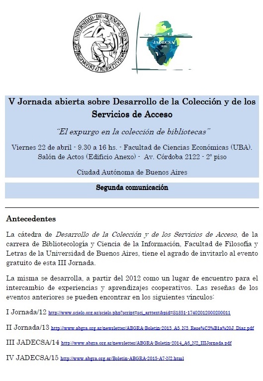 Se invita a toda persona interesada a las V JADECSA: Jornada sobre Desarrollo de la Colección y de los Servicios de Acceso con el tema "El expurgo en la colección de bibliotecas", organizado por la Cátedra de Desarrollo de la Colección y de los Servicios de Acceso de la Facultad de Filosofía y Letras de la Universidad de Buenos Aires, a realizarse el día 22 de abril en la Facultad de Ciencias Económicas, UBA.